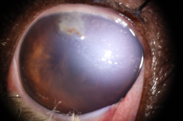 사진 1. 고양이 발톱에 의한 penetrating injury. 결막의 중등도의 충혈 및 부종 확인되며, 천공부위는 fibrin으로 일시적으로 막힘. 천공 부위 주변부 각막의 부종 확인됨. 전안방은 fibrin 및 출혈괴 확인됨. 안방수의 흐림정도는 매우 심하였으며, 홍채는 각막 열린 부분으로 부분 전방 유착 확인됨.