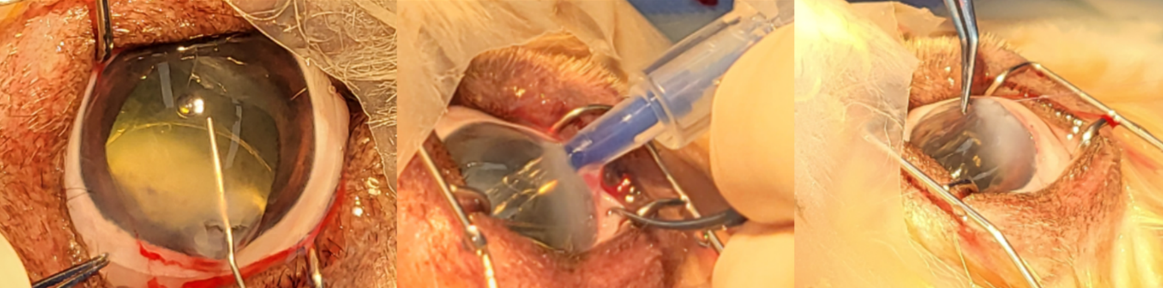 사진3. 수정체 파열까지 진행된 환자에서 수술적인 교정. 수정체 파열이 심한 경우에 수정체 물질에 의한 추가적인 염증 반응 및 감염으로 인한 지연 감염 증후근(SIS)이 발생할 수 있으므로 수술적인 교정이 필요함.