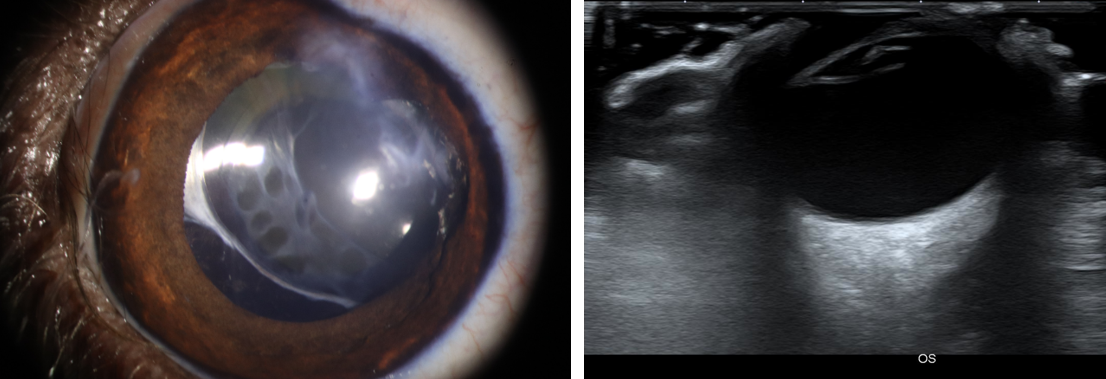 사진4. 이전 시력 소실, 안압 상승 확인되었으나 수술적 교정 후 이상 증상 없음. 수술 후 5개월 세극등 현미경 사진 (좌). 초음파 검사상 후안부 등 안구 조물에 이상 확인되지 않음 (우).
