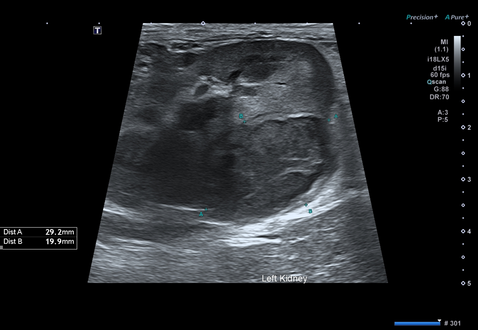 그러나 복부 초음파 검사에서 좌측 신장 후극에약 30 × 20 mm크기의 종괴가확인되었습니다.