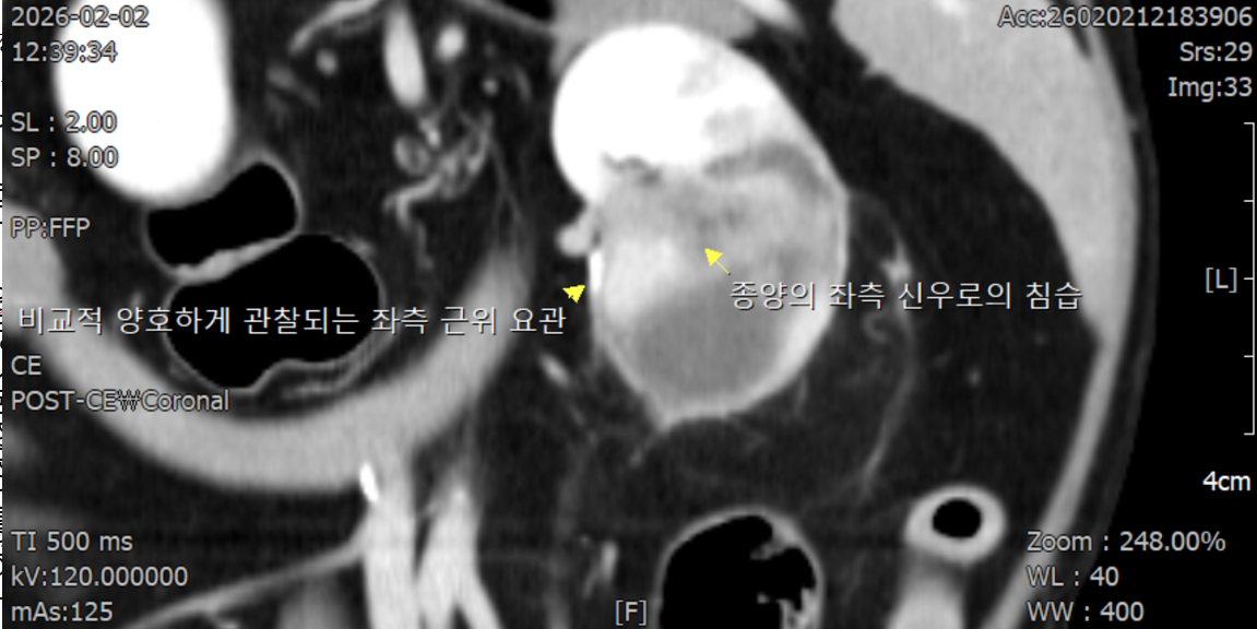 CT소견–좌측 신장 후극피질 유래의 크기 26mm*40mm의 조영 후 저감쇠성음영–간 좌측 안쪽엽에종괴가보이나 양성 병변 가능성이 더 높음–폐 우측 후엽의 미세결정 음영 CT검사상 전이 가능성은 상대적으로 낮은 상황이었습니다.