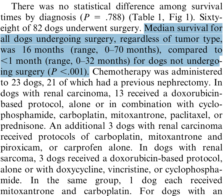 2006년 JVIM에발표된 연구에 따르면, 수술적 제거를 시행한 군의 중앙 생존기간(MST)은 16개월이었던 반면, 수술을 시행하지 않은 군의 생존기간은 1개월 미만으로 보고되었습니다.