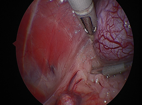 그 다음 신장에서 이어지는 요관을 따라 원위부로 추적하여 방광에 가까운 지점에서 둔성분리한 후 클립으로 결찰하고절단하였습니다.