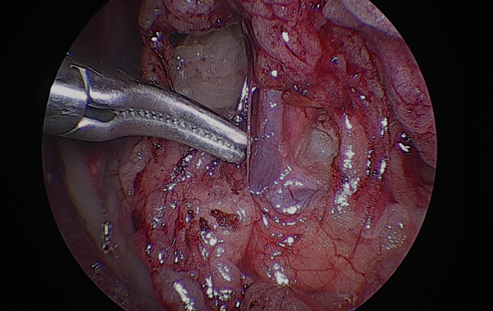신장을 충분히 노출한 뒤, 신혈관을 순차적으로 처리했습니다.우선신정맥을 둔성으로박리하여 분리한 뒤, 클립으로 결찰하고절단하였습니다.