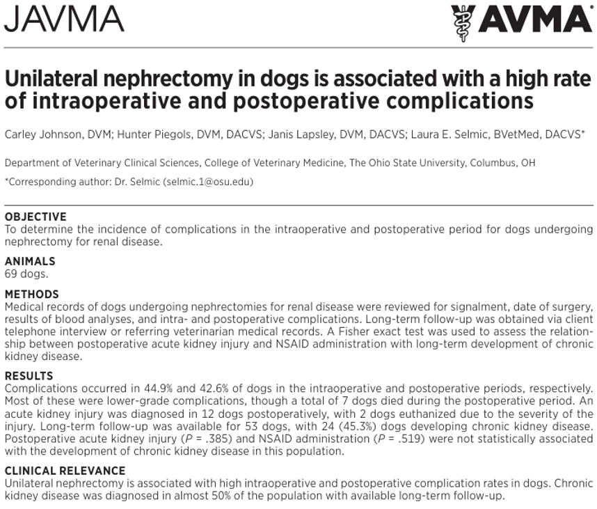 2024년 JAVMA에발표된 연구에 따르면, 일측 신장적출술후 약 17%에서 급성 신부전이 발생하였고, 이 중 일부는 그로 인해 사망에 이르렀습니다.