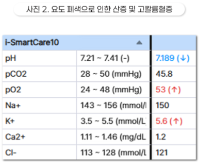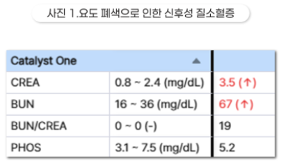 ● 혈액검사 → 요도 폐색으로 인한 신장 수치 상승, 고칼륨혈증이 동반될 수 있음