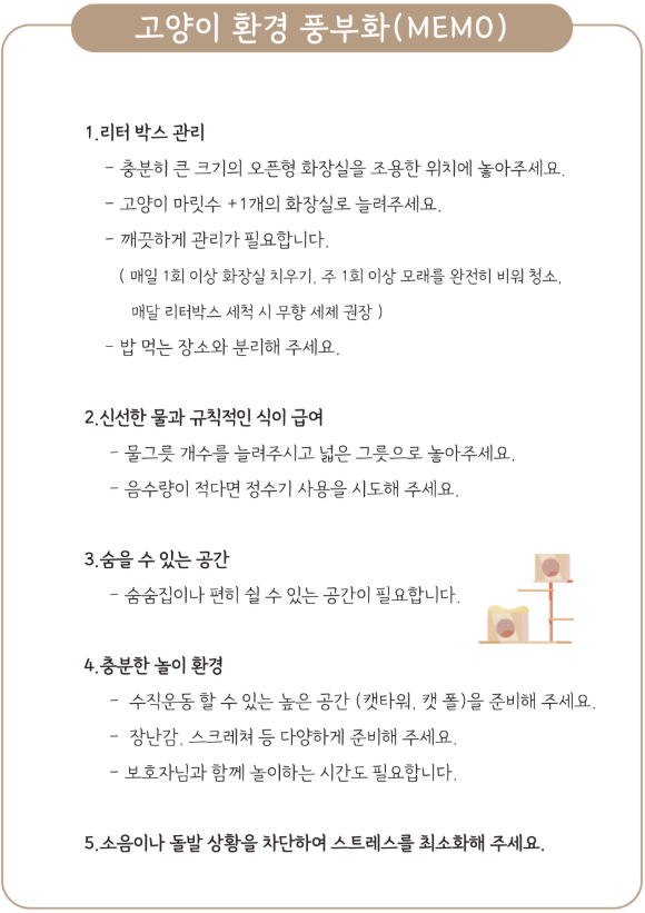 치료를 위해 가장 중요한 것은 가정에서의 환경 풍부화(MEMO)이며, 이를 위해서는 보호자님의 적극적인 협조가 필요합니다.