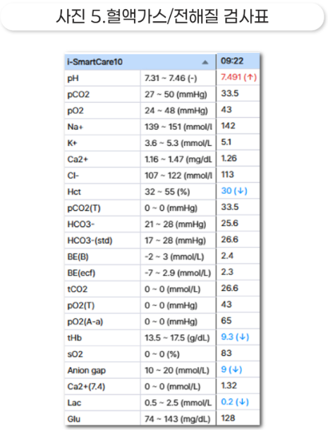 전해질: 나트륨과 칼륨 수치가 불안정 → 치료 과정에서 보정 필요
