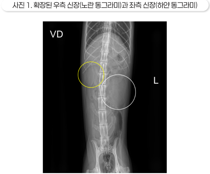 방사선 영상에서는 복수로 인해 복강 장기 전체가 보이진 않았지만 양측 신장이 모두 크게 나타났고, 특히 좌측 신장이 더 크게 나타났습니다.
