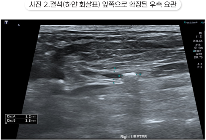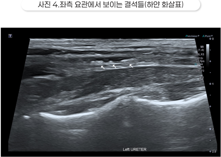 초음파 영상에서는 양측 수신증과 요관 결석이 확인되었습니다.