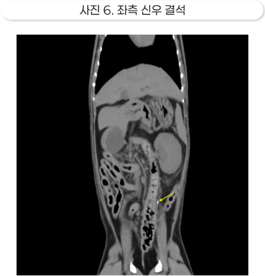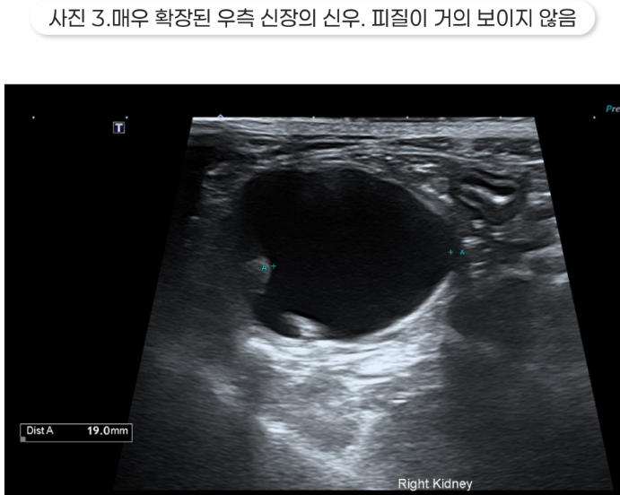 결석보다 가까운 쪽의 요관은 확장되어 있는데, 이는 요관 폐색을 의미합니다. 신우가 매우 확장되어 있었고, 특히 오른쪽 신장은 피질이 많이 얇아져 있고 심한 수신증 소견을 보였습니다.