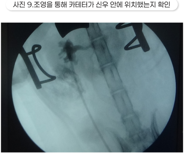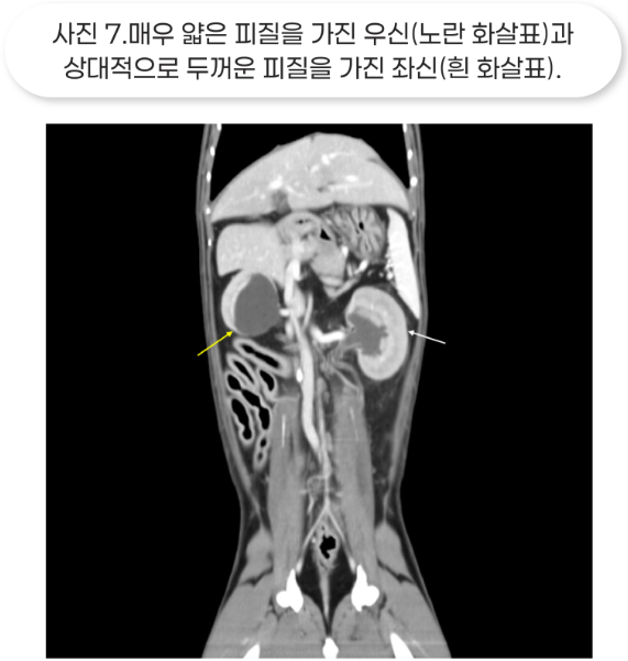 CT에서 정맥으로 조영제를 투여하면 일반적으로 1분 안에 신우에서 조영제가 보이는데, 조영제 투여 후 10분이 지나도 신우로 조영제가 나타나지 않아 신장 기능이 매우 떨어져 있음을 확인했습니다.