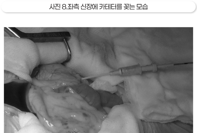 또 우측 신장에서는 아무리 기다려도 조영제가 아예 내려오지 않아 기능하지 않음을 확인했고, 때문에 우측 신장은 절제하고 좌측 신장에 SUB를 장착하기로 결정했습니다.