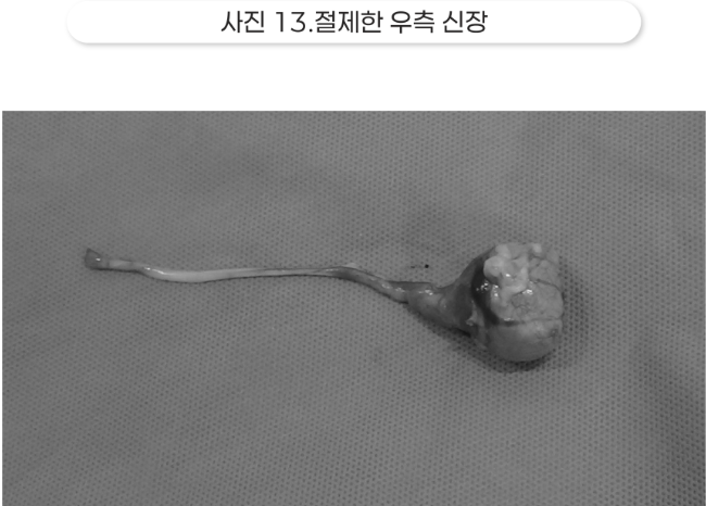 CT 조영 검사를 통해 신장 기능을 정밀 평가한 결과 기능을 완전히 상실한 우측 신장은 절제하고 기능을 유지 중인 좌측 신장에는 요관을 대신할 인공 우회로인 SUB를 장착하는 고난도 수술을 결정하였습니다.