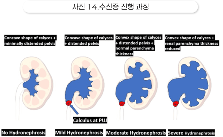 하위 단계에 폐색이 생기면 이전 단계에 요가 쌓이면서 압력이 상승하고, 신장의 신우가 크게 확장되다가 한계를 넘어서면 신장 피질 수준까지 침범하면서 수신증이 발생합니다.