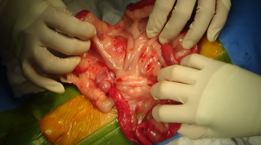 2. 장 색, serosa, mesenteric pulse, peristalsis로 small intestine의 viability를 판단하고, 괴사나 다발성 perforation이없기에 Enterotomy를 실시하였습니다