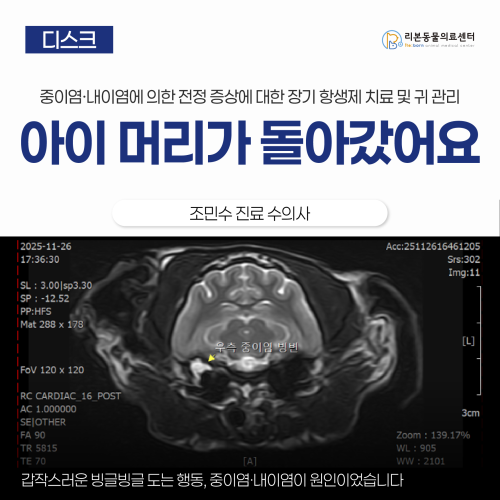 [본문 한 눈에 보기] ✅ 갑작스럽게 머리가 기울어지고 눈이 흔들리며 한쪽으로 도는 증상으로 내원한 5살 코리안 숏헤어 환자입니다. ✅ MRI 검사 결과 중이와 내이에 염증이 확인되어 말초성 전정질환(중이염·내이염)으로 진단하고 배양검사 후 항생제 치료를 진행했습니다. ✅ 약 6주간의 치료 후 신경 증상은 모두 소실되었으며 재발 방지를 위해 꾸준한 귀 관리가 권장됩니다. Case 소개 갓 5살이 된 코리안 숏헤어 환자는 당일 갑작스럽게 발생한 사경 증상 (머리가 한쪽으로 기우는 증상)과 동공이 양옆으로 흔들리고 오른쪽으로만 계속 도는 증상을 보여 내원하셨습니다. 보호자분은 전날까지 아무런 증상 없이 잘 먹고 놀던 아이가 갑자기 고장난 것 같은 모습을 보여 아이가 왜 이런 증상을 보이는지 나을 수는 있는지 알고 싶어하셨습니다. 진단 과정 내원 당시 vital은 정상적이었습니다. 며칠 전 타 의원에서 진행된 전반적인 건강 검진에서도 혈액 검사, 방사선 촬영, 초음파 상 특이 사항 하나 없이 모든 것이 정상적인 결과를 보이고 있었습니다. 유일하게 관리하던 질환은 외이염으로 주기적인 귀 세척을 받아오고 있었습니다. 타 병원에서 제공된 방사선 자료 및 혈액 검사 자료. 특이 사항은 확인되지 않습니다. 최근 자료에서 대사적인 문제는 배제되어 환자의 증상은 신경계의 문제에 기인했을 것으로 판단되었으며 증상들이 발작이나 의식 저하 등이 아닌 몸의 균형을 제대로 잡지 못하고 지속적인 어지럼증을 호소하는 전정계 증상에 가깝다는 점을 고려했을 때 말초성 전정계의 문제일 것으로 판단되었습니다. 과거의 외이염 병력과 말초성 전정계에 문제가 발생했을 것으로 추정되는 신경 증상을 조합했을 때 세균성 외이염이 중이 및 내이까지 전이되어 발생한 중이염/내이염의 가능성을 시사했습니다. 하지만 이는 어디까지나 문진과 신경계 평가만으로 진단된 것으로 미약한 초기 중추성 병변일 가능성을 완벽히 감별하기 위해 MRI 촬영이 필요했습니다. 간단한 마취전 검사 후 진행된 MRI 촬영 상 중이 내의 다량의 삼출물과 중이, 내이의 염증 소견이 관찰되었습니다. 이는 중이염/내이염을 지시하는 강력한 근거로 환자의 전정계 증상은 중이염/내이염에 의한 것으로 진단되었습니다. 다행히 환자의 소뇌, 뇌간 등 전정계를 담당하는 중추에 병변은 관찰되지 않았습니다. 이론적으로 중이염/내이염의 원인균을 감별하기 위해서는 고막을 절개해 내부의 삼출물을 흡인하는 Myringotomy가 필요했으나 침습적인 시술을 실시하기 전 외이염의 원인이 세균에 의한 것인지 우선 감별을 진행했습니다. 외이도 검사 상 환자의 귀는 발적과 농성 귀지가 잔뜩 들러붙어 있었습니다. 관찰되는 귀지를 채취하여 진행된 도말 검사 상에서는 좌측 귀의 세균 감염, 우측 귀의 진균과 세균의 동시 감염이 관찰되었습니다. 대부분의 중이염/내이염은 세균성 외이염이 더욱 진행되어 발생하는 경우가 많기 때문에 고막 절개술을 시도하기 전 해당 세균을 배양, 항생제 감수성 평가를 우선 시도하여 치료적 반응을 지켜보기로 하였습니다. 세균 배양 상 세종류나 되는 세균이 검출되었고 그 중 한 종류는 대다수의 항생제에 강력한 내성을 보였습니다. 치료 과정 환자의 치료 과정은 약 5주간 지속되었습니다. 항생제 내성이 적은 균은 가벼운 광범위 항생제를 항생제 내성이 강한 균은 경구 복용이 가능한 항생제가 한 종류 뿐이라 우선 경구 복용을 하되 치료 반응이 떨어질 경우 IV로 투여해야만 하는 강력한 항내성균 항생제 투여를 시도할 예정이었습니다. 다행히 환자의 사경 증상은 항생제를 복용한지 2주 째에 천천히 돌아왔으며 3주째에 눈이 흔들리는 증상이 소실되었습니다. 6주차에 환자는 마침내 신경 증상이 모두 소실되어 이전과 같은 모습으로 돌아올 수 있었습니다. 예후 중이염/내이염은 재발이 매우 쉽게 나타나는 질병이며 치료 반응 상 세균성 외이염이 유발 원인일 것으로 강력히 시사되었기에 꾸준히 국소 항생제를 이용한 귀 세정을 진행하는 것을 추천드렸습니다. 다행히 환자는 아직 신경 증상이 재발하지 않고 있습니다. 질병 소개 중이염/내이염이란? 고막 뒤쪽의 중이, 내이에 발생하는 염증·감염 상태로 개·고양이 말초성 전정질환의 가장 흔한 원인 중 하나입니다. 특히 노령견에서 말초 전정 질환의 약 50%를 차지하는 것으로 알려져 있습니다. 발생 원인으로는 외이염의 전이, 유스타키오관을 통한 상행성 감염, 혈행성 전파 등이 있습니다. 진단 원칙 중이염/내이염의 진단은 단계적으로 진행됩니다. 우선 신경 증상이 전정 증상인지 먼저 확인해야 합니다. 전정 증상으로는 머리를 한쪽으로 기울이고 있는 사경 증상, 동공이 가만히 있지 못하고 반복적으로 움직이는 nystagmus, 균형 소실, 한 방향으로만 도는 circling 등이 있습니다. 전정 증상임이 확인되었다면 해당 증상이 중추성 병변에 의한 것인지 말초성 병변에 의한 것인지 판단해야 합니다. 일반적으로 중추성 병변에 의한 전정 증상을 보이는 환자는 의식 수준이 떨어져 있거나 circling의 범위가 넓다는 등의 차이가 있으나 초기 병변이거나