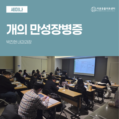 명절이 지나고 나면 평소 먹지 않던 음식이나 갑작스러운 식이 변화로 구토나 설사 증상으로 내원하는 아이들이 생각보다 많습니다. 대부분은 일시적인 위장 문제로 회복되지만 이런 증상이 반복되거나 오래 지속된다면 단순한 장염이 아니라 만성 장질환 가능성도 함께 확인해볼 필요가 있습니다. 지난 2월12일 목요일 리본동물의료센터에서는 지역 원장님들을 대상으로 ‘개의 만성 장병증(CIE)’을 주제로 한 월례 세미나가 진행되었습니다. 만성 장질환은 식이 관리부터 약물 치료, 정기적인 모니터링까지 단계적으로 접근해야 보다 안정적인 회복을 기대할 수 있습니다. 리본동물의료센터 내과팀은 아이의 상태에 맞춘 체계적인 내과적 치료 계획으로 아이들이 편안한 일상을 되찾을 수 있도록 함께하고 있습니다. 다음 월례세미나는 2026년 3월 5일(목) 김현호 외과대표원장님의 「증례로 알아보는 간담도질환의 관리」입니다. 더 깊이 있는 임상지식과 경험을 나누며 보호자님과 우리 아이에게 더욱 신뢰받는 진료를 이어가겠습니다. 감사합니다 :)