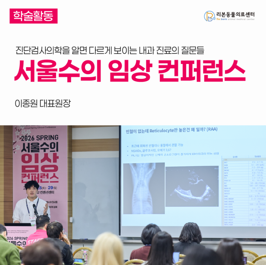 리본동물의료센터 이종원 대표원장님의 2026년 춘계 서울수의임상컨퍼런스 강연 소식을 전해드립니다.