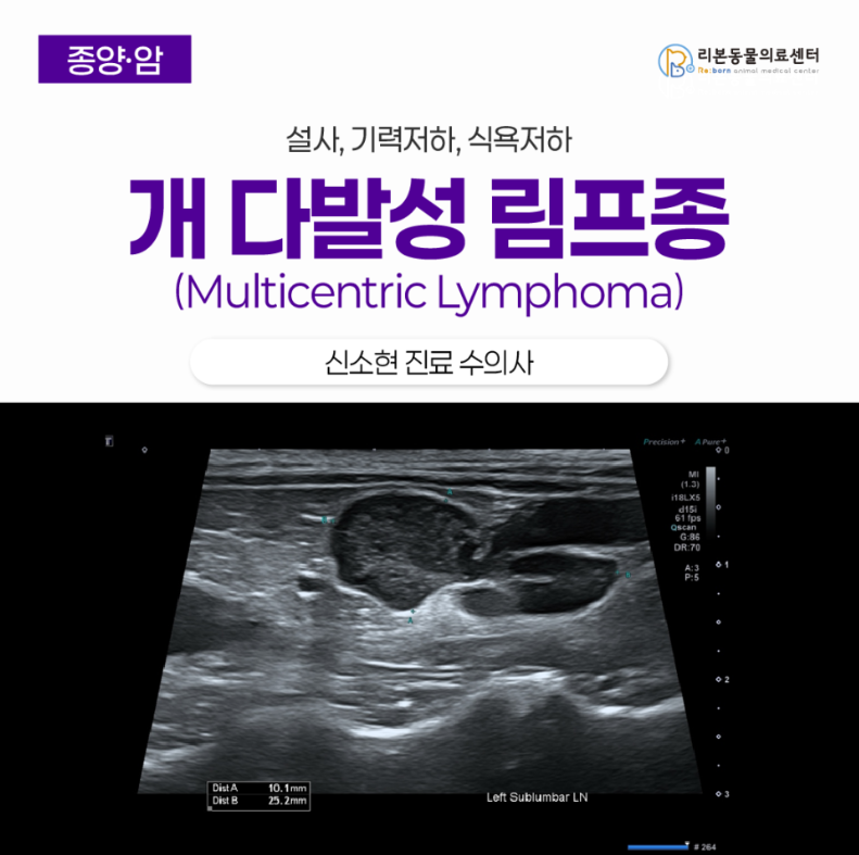 ✅ 설사와 기력 저하로 내원하여 초음파와 세포 검사(FNA)를 진행한 결과, 비장과 림프절 전반에 퍼진 다발성 림프종으로 확진되었습니다.