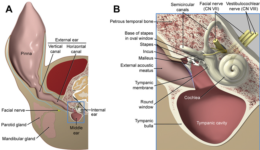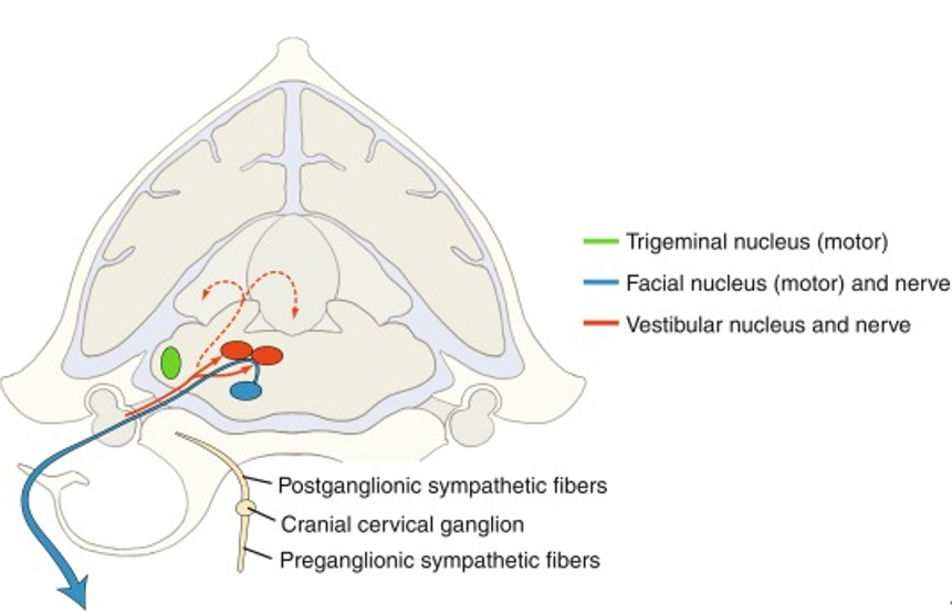 이러한 해부학적 특성은 전정 증상과 안면신경 마비의 병발을 설명하는 중요한 구조적 배경입니다. (출처: Veterinary Clinics of North America Small Animal Practice 42(6):1109–26)