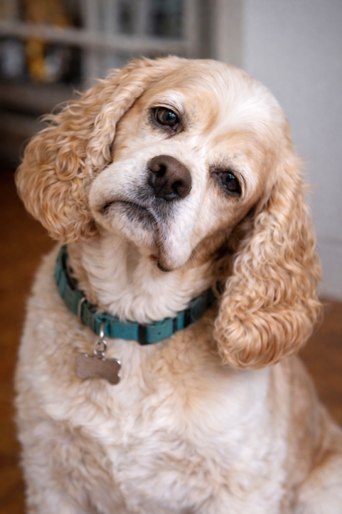 그림 3. 안면신경(CN VII) 마비와 전정 증상이 병발된 코커스파니엘. 좌측 사경(head tilt)과 함께 동측 안면에서 눈꺼풀과 입꼬리의 처짐이 확인됩니다.