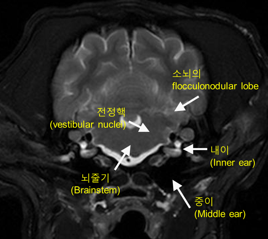 반면 공기가 차 있는 중이(고실)는 무신호(저신호)로 나타납니다. 전정핵은 MRI 상에서 뚜렷한 경계로 구분되지는 않지만 연수(medulla oblongata)의 dorsolateral에 위치합니다.
