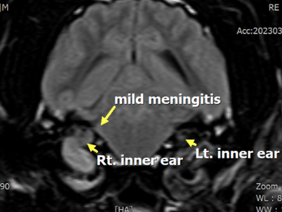 그림 5. 중이염과 내이염이 병발한 개의 FLAIR MRI 영상.