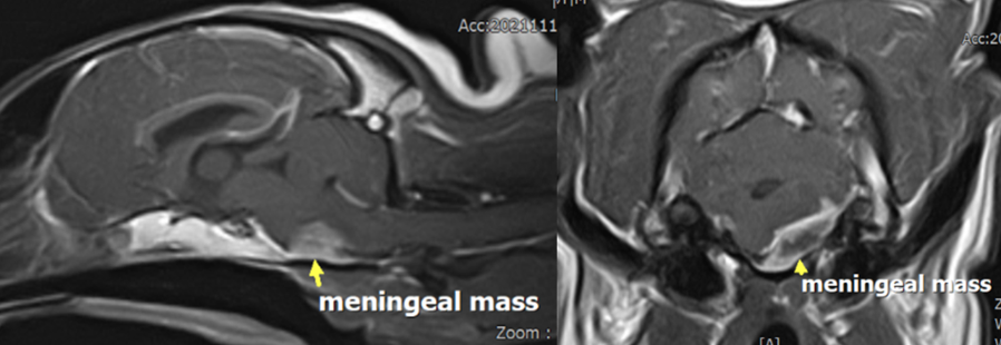 그림 6. 안진이나 보행 이상 없이 좌측 사경을 보이는 개의 MRI 영상