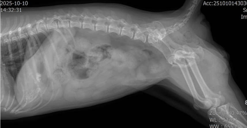 bladder 안에 다수의 결석(cystolith)이 확인되었고, urethra(요도) 방향으로도 여러 개의 결석이 내려가 있는 상태가 확인되었습니다.