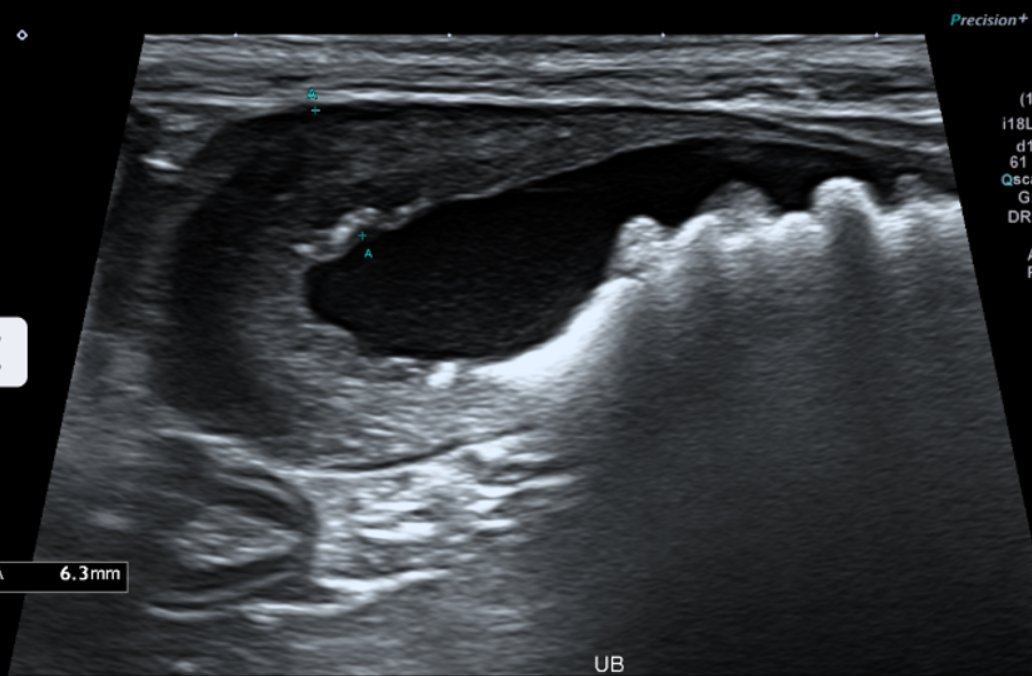 초음파에서 bladder 내 다수의 방광결석,urethra 쪽으로 내려간 결석들,bladder wall 비후(방광염 소견)가 동시에 확인되었습니다.