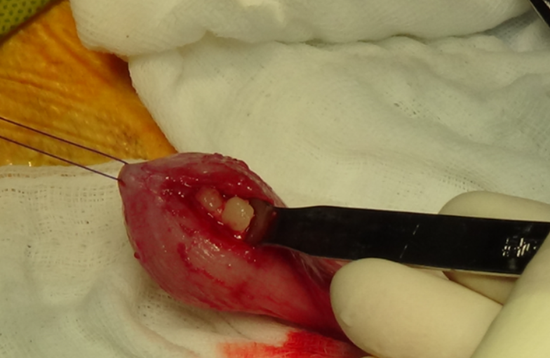 Bladder의 아랫부분(ventral surface)에 세로 방향으로 작은 절개를 내는 ventral cystotomy를 시행했습니다.