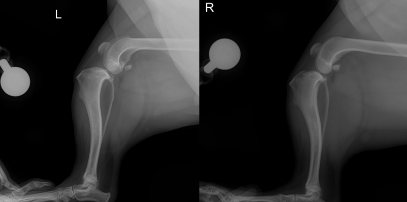 아이의 경우 좌측 stifle X-ray에서 관절염 변화와 함께 cranial cruciate ligament 파열에서 흔히 보이는 정강이뼈가 앞쪽으로 밀려난 소견이 보여 무릎의 불안정성이 의심되었습니다.”