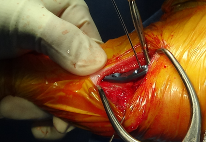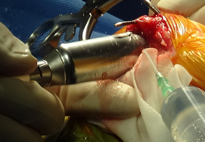 수술 부위를 절개한 뒤, 정강이뼈 위쪽을 안전하게 노출한뒤 TPLO 전용 톱을 이용해 정강이뼈 위쪽을 원형으로 절골합니다.
