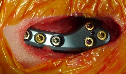 회전한 뼈가 움직이지 않도록 TPLO plate와 screws로 단단하게 고정해 뼈가 안정적으로 붙을 수 있게 합니다.