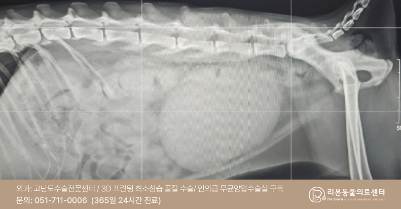 이에 복부 방사선 검사를 시행한 결과 영상상에서도 심하게 확장된 방광이 확인되었습니다.