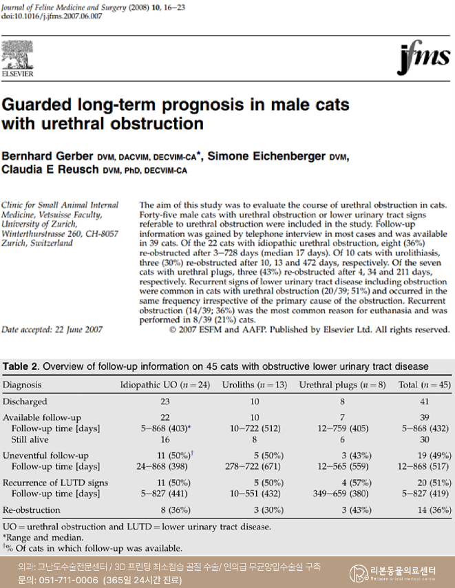 Journalof FelineMedicineand Surgery(2008)에 발표된 연구에 따르면 요도 폐색을 경험한 고양이의 약 36%에서 재폐색이발생했으며 그중 절반 이상은 반복적이고 심한 재폐색으로인해 안락사에 이르렀다고 보고되었습니다.