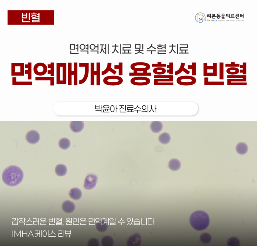 IMHA(Immune-mediated hemolytic anemia) 즉 면역 매개성 용혈성 빈혈은 자가 면역성 질환으로 면역계가 자신의 적혈구를 공격하여 파괴되는 심각한 빈혈 질환입니다.