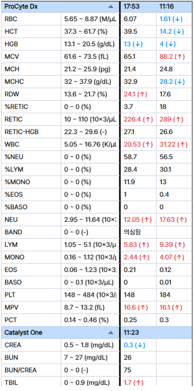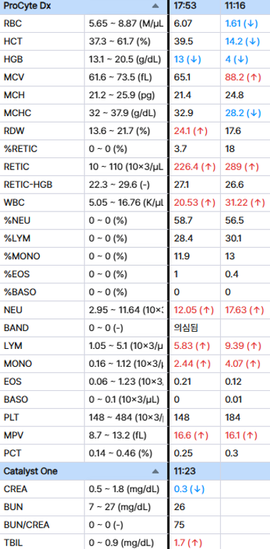 미미는 혈액검사를 매일 진행하였고 수혈이후 빈혈수치가 떨어진 것이 확인되었습니다.