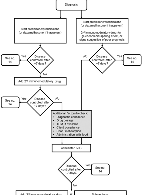 IMHA로 진단이 된 후 치료는 1) 초기 치료 2) 유지 치료 및 재발과 합병증 예방 단계 3) 재발 관리로 3단계로 구분됩니다.