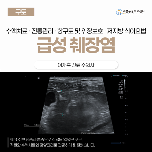 [본문 한 눈에 보기] ✅ 하루 동안 반복된 구토와 식욕 부진으로 내원한 10살 치와와 ‘코코’는 검사 결과 급성 췌장염으로 진단되었습니다. ✅ 탈수 교정을 위한 수액치료와 진통, 항구토, 위장보호 관리 등 지속적인 지지요법으로 염증 수치가 점차 호전되었습니다. ✅ 본원에서 체계적인 입원 치료와 저지방 식이 조절을 통해 코코는 구토 없이 식욕과 활력을 회복하며 건강하게 퇴원했습니다. 어떤 증상으로 내원했나요? 10살 치와와 코코는 하루 동안 여러 차례 구토하고 밥을 거부해 병원에 내원했습니다. 보호자님께서는 “먹는 걸 거의 다 토하고, 배를 움츠리고 웅크리고 있다”고 하셨습니다. 진단 과정 ‘코코’의 구토 원인을 찾기 위해 여러가지 검사를 진행하였습니다. - 신체검사: 체온 39.8, 복부통증, 탈수 5% - 혈액검사: qPL 2000< 상승, 간수치 미약한 상승 - 복부초음파 췌장의 실질은 저에코를 나타내고 있고 주변 지방은 에코가 상승되어 있습니다. 종합하였을 때 코코의 구토의 원인은 급성 췌장염으로 진단 되었습니다. 치료 과정 췌장염에 대한 입원 치료는 췌장이 스스로 염증을 가라앉히고 회복할 수 있도록 ‘몸을 지탱해주는 치료’ 즉 지지요법이 중요합니다. - 수액요법: 탈수 및 전해질 불균형을 교정하고, 췌장으로 가는 혈류를 유지시켜 추가적인 손상을 방지합니다. - 진통제: 췌장염은 심한 복통을 유발하므로 통증을 완화시키는 약물을 투약합니다. - 항구토제, 위장관보호제: 구토가 반복될 경우 탈수와 전해질 불균형이 심화되기에 구토를 멈추고 위장관을 안정시킵니다. - 항생제: 대부분 췌장염은 비감염성 질환이라 필수적이진 않지만, 패혈증 이나 위장관 장벽 손상으로 인한 세균 감염의 위험이 있을때 예방적으로 사용합니다. - 영양 관리: 구토가 멎은 후 저지방 식이를 소량 급여합니다. - 혈당, 전해질, 혈압 모니터링 치료 경과 및 퇴원 입원 기간 동안 코코는 추가적인 구토나 설사 등 소화기 증상 없이 안정적인 회복 과정을 보였습니다. 반복적인 혈액검사에서도 qPL 수치가 점차 감소하는 양상을 보여 염증이 호전되고 있음을 확인할 수 있었습니다. 또한 복부 초음파 재검사에서 이전에 관찰되던 췌장 주변 지방의 고에코성 변화와 부종 소견이 개선되는 것으로 확인되었습니다. 이에 따라 식욕과 활력이 모두 회복된 상태로 치료를 마치고 코코는 무사히 보호자님의 품으로 돌아가 통원 치료로 전환하게 되었습니다. 강아지 췌장염 이란? 췌장은 음식을 소화시키는 효소와 혈당을 조절하는 호르몬(인슐린 등)을 만들어내는 중요한 기관입니다. 그런데 어떤 원인으로 인해 췌장에서 만들어진 소화 효소가 제때 분비되지 못하고 오히려 췌장 내부에서 ‘조기 활성화’되면 췌장이 자기 스스로를 소화하기 시작하면서 강한 염증 반응이 발생하게 됩니다. 이것이 바로 췌장염이며, 염증이 췌장 주변의 지방·간·담낭으로 확산되면 전신 염증 반응(SIRS)이나 쇼크로 이어질 수도 있는 위험한 질병입니다. 췌장염의 주요 원인과 위험 요인 구분 주요 요인 설명 식이성 요인 고지방 음식, 사람 음식 섭취, 급격한 식단 변화 가장 흔한 원인. 기름진 간식·고기류 섭취 후 발병 사례 다수 대사성 요인 고지혈증, 고칼슘혈증, 비만 슈나우저, 미니핀 등은 고지혈증 소인이 높음 약물 스테로이드, azathioprine 등 췌장 효소 활성화 또는 혈류 감소 유발 가능 내분비 질환 쿠싱증후군, 당뇨병, 갑상선기능저하증 대사 이상으로 췌장 부하 증가 기타 외상, 복부 수술 후, 허혈성 손상, 감염성 질환 드물지만 급성 췌장염의 촉발 요인 가능 특히, 치와와, 요크셔테리어, 미니어처 슈나우저, 푸들 같은 소형견에서 발병률이 높고, 중년-노령견 (7세 이상) 에서 잘 나타납니다. 회복 후 관리 및 재발예방 앞서 입원 치료 과정에서 설명 드린 것처럼 췌장염의 회복에는 특별한 약보다 지속적인 지지요법과 세심한 모니터링이 가장 중요합니다. 입원 치료를 통해 안정적으로 회복되었다고 하더라도 췌장염은 재발률이 높고 생활 습관의 영향을 크게 받는 질환입니다. 따라서, 퇴원 후에는 재발을 막기 위한 관리와 예방이 치료의 연장선이라 할 수 있습니다. 01. 식이 관리 (가장 중요) 저지방 처방식을 지속적으로 급여해야 합니다. (예: Hill’s i/d Low Fat, Royal Canin GI Low Fat 등) 사람 음식, 간식, 고기국물, 기름진 간식은 피하도록 합니다. 급여 횟수는 하루 3~4회로 나누어 한 번에 많이 먹지 않게 합니다. 02. 체중 및 대사 질환 관리 비만, 고지혈증, 내분비 질환이 있다면 반드시 함께 조절해야 합니다. 공복혈당, 콜레스테롤, 중성지방에 대해 주기적으로 모니터링이 필요합니다. 03. 정기검진 췌장효소 수치, 혈중 지질 수치 등을 치료 후 1개월, 3개월, 이후 6개월~1년 간격으로 정기적인 재검사와 영상 평가가 권장됩니다. 특히, 식욕 저하나 구토가 다시 나타난다면 즉시 재검사가 필요합니다. 04. 스트레스 관리 스트레스 호르몬은 소화관 운동을 억제하고, 췌장 내 혈류를 감소시켜 췌장염의 재발 가능성을 높입니다. 낯선 환경, 장시간 공복, 급격한 식단 변화, 과도한 운동 등도 피하는 것이 좋습니다. 췌장염은 한 번 회