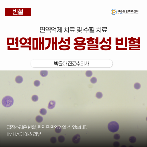 [본문 한 눈에 보기] ✅ 갑작스러운 기력 저하와 짙은 소변색, 점막 창백 증상으로 내원하였습니다. ✅ 혈액검사와 도말검사, 감염성 빈혈 PCR 검사 배제를 통해 IMHA로 진단하고 수혈 및 면역억제 치료를 진행하였습니다. ✅ 반복 수혈과 면밀한 모니터링으로 안정화에 성공하였으며 현재는 통원 치료로 전환해 장기 관리 중입니다. 갑작스러운 빈혈, 원인은 면역계? IMHA 케이스 리뷰 6세 암컷 말티즈 미미는 갑작스럽게 기력이 떨어지고 소변 색이 진한 오렌지색(빌리루빈뇨)으로 변하며 점막이 창백해져 내원했습니다. 보호자님께서는 평소 외부구충은 잘 관리하고 있었으며 1주 전까지는 큰 문제 없이 잘 지냈지만 갑자기 식욕이 감소하고 기운이 없어져 걱정되어 병원을 찾으셨습니다. 진단 과정 미미는 내원 당시 전반적인 활력 저하와 점막 창백이 있었고 혈액검사 결과 심각한 빈혈이 확인되어 빈혈의 원인을 찾기위한 정밀 검사를 진행하였습니다. • CBC 검사: 중등도~심한 재생성 빈혈 • 혈액도말: Spherocyte 다수, 응집(SAT) 양성 • Chemistry: Total bilirubin 상승 • 소변검사: 빌리루빈뇨 확인 정밀 검사 결과 개에서 나타나는 면역매개성 용혈성 빈혈이 강하게 의심되는 상황이었습니다. Figure 1. 내원당시 혈액검사 결과 – 오른쪽 Figure 2. 혈액 도말상 확인되는 spherocyte. Figure 3. 원내에서 확인된 빌리루빈뇨 Figure 4. PCR 검사 의뢰 결과 IMHA란 무엇인가요? IMHA(Immune-mediated hemolytic anemia) 즉 면역 매개성 용혈성 빈혈은 자가 면역성 질환으로 면역계가 자신의 적혈구를 공격하여 파괴되는 심각한 빈혈 질환입니다. 그중에서도 primary IMHA는 감염, 종양, 약물 등 특정 자극에 의해 발생하는 경우를 모두 배제한 후에도 원인이 밝혀지지 않는 경우를 지칭합니다. primary IMHA의 경우 모든 연령의 개에서 발생가능하며 평균 나이는 5~7살입니다. 코카 스파니엘, 닥스훈트, 푸들, 쉽독 등의 종에서 호발하며, 고양이의 경우 호발하는 품종은 확인되지 않습니다. IMHA에서 주로 나타나는 임상증상 임상 증상의 정도는 용혈의 정도, 합병증, 기저 질환에 따라 달라집니다. 일반적인 증상은 빈혈, 식욕부진, 빌리루빈뇨, 황달 등이 나타납니다. 때때로 구토, 설사, 발열, 비장비대, 간비대가 나타날 수 있습니다. 고양이의 경우, 이식증이 나타나며 오랫동안 빈혈이 이어질 경우 2차적인 심근병증이 생길 수 있습니다. IMHA 자체도 문제이지만 혈전이 잘 생기는 환경이 조성되면서 폐혈전색전증 (PTE) 발생시 예후 불량할 수 있습니다. 어떻게 치료하나요? Figure 5. IMHA 치료 단계 IMHA로 진단이 된 후 치료는 1) 초기 치료 2) 유지 치료 및 재발과 합병증 예방 단계 3) 재발 관리로 3단계로 구분됩니다. 초기 치료에서는 우선 극심한 빈혈이 있는 환자의 경우 수혈이 필요합니다. 일반적으로 수혈은 임상 증상과 혈구검사상 빈혈의 정도, 빈혈이 진행되는 속도에 따라 결정됩니다. 치료는 스테로이드 약물로 시작하며 중증이거나 치료 반응이 부족한 경우 2차 면역억제제를 추가합니다. 개에서는 특히 혈전 예방이 중요하기 때문에 항응고제와 항혈소판제를 혈소판 수치를 모니터링 하면서 함께 사용합니다. 유지 치료 및 재발과 합병증 예방 단계에서는 빈혈 수치가 안정적으로 유지되고 임상증상이 잘 조절되는 환자에게 해당합니다. 이 단계에서는 약물의 용량을 줄여가며 너무 빨리 약물을 감량하면 재발 위험성이 크기 때문에 혈액검사 결과와 환자의 컨디션에 따라 아주 신중하게 진행합니다. 또한 이 기간 동안에는 장기간 스테로이드 복용으로 인한 위궤양과 출혈이 나타날 수 있으며 약물로 인한 요로 감염이 잘 발생하기 때문에 병원에 내원하여 소변검사를 주기적으로 진행하며 관리합니다. 그 다음은 재발 관리 단계입니다. IMHA는 재발이 꽤나 흔한 질병이며 개에서는 최대 30%까지 재발됩니다. 이때 치료는 다시 prednisolone의 용량을 증량하며 다른 면역억제제와 병용하게 됩니다. 미미는 어떻게 치료 했나요 미미는 심한 빈혈을 나타내고 있었으며 원내에서 수혈 먼저 진행하였습니다. Figure 6. 수혈 진행 후 혈액검사 결과 (왼쪽) 혈액검사 결과, 빈혈수치(HCT)은 14.2 -> 39.5로 상승되었습니다. 환자 안정화 후 면역억제제 치료를 시작했습니다. 스테로이드와 2차 면역억제제 치료를 함께 사용하였고, 이후 입원 진행하여 빈혈수치와 용혈 수치를 모니터링 진행하였습니다. Figure 7. 이후 혈액검사 모니터링 결과 미미는 혈액검사를 매일 진행하였고 수혈이후 빈혈수치가 떨어진 것이 확인되었습니다. 이는 아직 용혈 반응이 뚜렷하게 나타난 결과로 면역억제 치료 시작 후 반응이 나타나기까지 1~2주 정도 소요될 수 있습니다. 따라서 우선 환자 안정화를 위해 2차 수혈을 시행하였고 이후 입원을 진행하였습니다. Figure 8. 2차 수혈 후 혈액 검사 모니터링 2차 수혈 후 계속 입원 진행하였으며 빈혈 수치가 더 이상 떨어지지 않는 것 확인되었습니다. 따라서 미미는 퇴원진행하여 경구 약물과 통원치료로 전환하였고 보호자님께도 가정내에서 빌리루빈뇨, 기력저하, 점막 창백 등이 나타날시 재진 날짜가 아니더라도 병원에 내원하시기를 안내드렸습니다. IMHA의 
