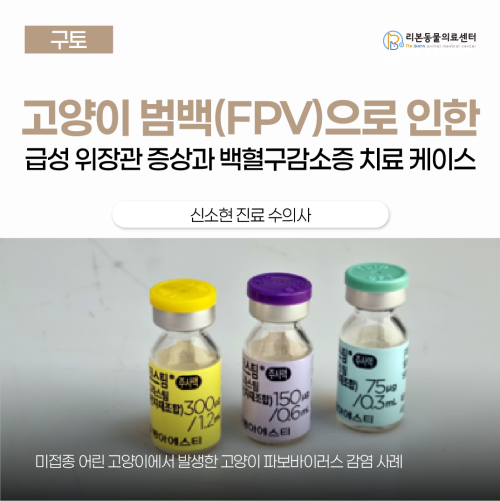 [본문 한 눈에 보기] ✅ 8개월령 미접종 고양이가 반복적인 구토와 설사 증상으로 내원하여 감염병이 의심되었습니다. ✅ 검사 결과 고양이 범백 양성과 심한 백혈구감소증이 확인되어 격리 입원 후 집중 치료를 시작했습니다. ✅ 대증 치료와 백혈구 생성 주사를 병행하며 24시간 모니터링 하에 회복하고 있습니다. 고양이 범백(FPV, feline panleukopenia) 어떤 증상으로 내원했나요? 8개월령 코리안숏헤어 환자가 반복적인 구토 및 설사 증상으로 내원하였습니다. 어린 연령과 미접종 상태라는 점 실외 생활 및 다묘 가정인 점을 고려했을 때 감염병이 가장 의심되는 상황이었습니다. 진단 과정 환자는 반복적인 구토와 설사로 인해 눈동자가 움푹 들어갈 정도로 탈수가 심했고 전해질 불균형 또한 확인되었습니다. 원인 감별을 위해 혈액 검사와 동시에 키트 검사를 진행했습니다. 키트 검사에서 고양이 파보바이러스(=범백) 항원 양성이 확인되었고 혈액검사에서도 심한 백혈구감소증이 확인되었습니다. 1. 고양이 파보 키트 검사에서 양성 확인 2. 혈액검사 상에서 범백혈구감소증과 혈소판감소증 확인 진단과 동시에 환자는 격리실에 입원하여 집중 치료를 받기 시작했습니다. 치료 과정 고양이 범백에 특이적인 치료제는 없으며 치료에 가장 중요한 것은 대증 치료를 통해 몸의 면역력 증진과 회복을 돕는 것입니다. 그럼에도 불구하고 증상 개선이 더디고 백혈구 수가 정상화되지 않는다면 백혈구(특히 호중구) 생성을 촉진하는 주사를 적용할 수도 있습니다. 환자의 경우 내원 시점부터 백혈구감소증이 매우 심해 입원 당일부터 백혈구 생성 주사를 함께 적용하게 되었습니다. 대증 치료 → 항구토제, 위장관보호제, 지사제 등을 적용하며 증상 개선 목표 항생제 처치 → 장염에 준한 항생제 투약 및 2차 감염 예방 백혈구 생성 주사(G-CSF) → 백혈구(특히 호중구) 수 증가 목적 저체온, 저혈압 발생 시 가온 처치, 승압제 적용 등 추가 관리가 필요함 3. G-CSF 주사제 현재 환자는 24시간 내내 철저한 모니터링을 받으며 입원 중에 있으며 상태 회복을 위해 모든 의료진이 최선을 다하고 있습니다. 예후 고양이 파보바이러스의 경우 어린 연령에서 잘 감염되고 특히나 미접종 상태의 면역이 취약한 아이에게 쉽게 감염되기 때문에 공격적인 처치에도 불구하고 예후가 좋지 않은 질환입니다. 전체 생존율은 약 50%로 보고되어 있습니다. 나이가 어리고 심한 백혈구감소증이 있거나 혈소판감소증이 동반될 수록 예후가 불량할 가능성은 높아집니다. 고양이 범백(파보바이러스 감염증)이란? 고양이 파보바이러스(FPV)는 작고 단단한 DNA 바이러스로 고양이에게 치명적인 감염을 유발할 수 있습니다. FPV는 활성 감염 상태의 고양이에서 나오는 분비물(침, 소변, 토사물, 대변 등)로 퍼지며 특히 대변을 통한 전파가 가장 흔합니다. 또한 오랜 시간 환경에서 생존하기 때문에 침구류, 밥그릇, 옷, 리터박스 같은 매개물을 통해 감염될 수도 있습니다. 고양이 파보바이러스는 빠르게 분열하는 세포를 공격합니다. 특히 림프조직(면역기관), 골수, 장 점막 등이 주로 영향을 받으며 이로 인해 범혈구감소증, 설사, 구토 등의 임상 증상이 나타나게 됩니다. 특히 면역세포가 파괴되고 백혈구감소증이 발생할 경우 2차 감염 위험이 크게 증가합니다. 다행히 고양이 파보바이러스의 경우 백신이 개발되어 있고 백신의 효과가 뛰어나기 때문에 가장 좋은 예방법은 시기적절한 예방접종일 것입니다.