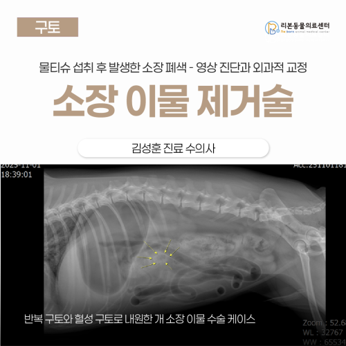 [본문 한 눈에 보기] ✅ 반복적인 구토와 혈성 구토 증상으로 내원한 환자에서 영상 검사상 소장 이물이 확인되었습니다. ✅ 수술 전 수액으로 안정화 후 소장 절개술을 통해 이물을 제거하였고 장의 생존성은 양호했습니다. ✅ 조기 수술로 장 절제 없이 회복이 가능했으며 합병증 없이 안정적인 경과를 보였습니다. 개 소장 이물 수술 케이스 소개 어떤 증상으로 내원했나요? 2–3일 전부터 vomiting이 심해졌고 하루 1회 정도 노란색 구토가 있었습니다. 금일에는 5–6회 구토했고 마지막에는 혈액이 섞여 나왔습니다. 이전 산책 중 물티슈를 먹은 전력이 있으며 금일 아침부터 식욕이 떨어져 식이를 거부했습니다. 진찰 소견과 활력징후 (P/E & Vitals) 통증·불안·구토로 스트레스 반응이 동반된 상태로 보이며 반복 구토로 탈수·전해질 불균형 가능성이 있습니다. 진단 과정 X-ray 소장의 이물 음영이 보이고 mechanical obstruction으로 인해 소장의 가스음영이 관찰되었고 더 명확히 이물의 존재 확인을 위해 초음파 검사가 진행되었습니다. Ultrasound에서 small intestine 내 foreign body가 확인되었고 Intestinal foreign body로 인한 mechanical obstruction이 강하게 의심됩니다. 주요 증상 반복적인 구토 → 혈성 구토 발생, 식욕 저하 (과거 물티슈 섭취 전력 확인) 진찰 소견 통증과 불안, 반복 구토로 인한 탈수 및 전해질 이상 의심 진단 결과 X-ray와 초음파 검사에서 소장 내 이물로 인한 장폐색 확인 치료 방향 수액으로 상태를 안정화한 뒤 소장 이물 제거 수술 진행 치료 1) 수술 전 안정화 반복된 vomiting으로 인한 탈수·전해질 이상 여부를 모니터링했고 IV fluid로 1차 교정을 시작했습니다. 2) 수술적 교정 1. 배를 중앙선(Ventral midline celiotomy)으로 열고 GI tract 전체를 차례로 확인해 foreign body 위치와 주변 상태를 봅니다. 2. 장 색, serosa, mesenteric pulse, peristalsis로 small intestine의 viability를 판단하고, 괴사나 다발성 perforation이없기에 Enterotomy를 실시하였습니다 3. 이물이 있는 small intestine 구간은 moistened sponge로 둘러 오염이 다른 곳으로 퍼지지 않게 차단합니다. 4. 이물 바로 뒤쪽 antimesenteric border에 작은 절개(enterotomy)를 만들어 통로를 냅니다. 5. 장을 부드럽게 자극해 이물을 절개창으로 옮겨 꺼내고, 과도한 당김 없이 양쪽 장에 추가 손상·이물이 없는지 다시 확인합니다. 6. warm sterile saline으로 장 안팎을 씻고 오염된 기구·장갑을 교체한 뒤 봉합하고 마지막에 saline을 넣어 leak test로 suture line 누수가 없는지 확인해주었습니다. ① 수술 전 안정화 반복된 구토로 인한 탈수와 전해질 이상을 먼저 확인하고 수액 치료로 몸 상태를 안정시킨 뒤 수술을 진행했습니다. ② 수술적 교정 복부를 열어 소장 전체를 확인하고 장의 상태가 살아 있어 소장을 작게 절개해 이물만 제거했습니다. 수술 중 오염을 최소화하고 봉합 후에는 누수 여부까지 꼼꼼히 확인했습니다. 질병 소개 Small intestine(소장) 안에 foreign body(장난감 조각, 물티슈, 비닐, 나뭇가지, 뼈, 줄 등)가 걸려 음식물과 가스가 통과하지 못하는 상태를 말합니다. Linear foreign body(실·끈·로프·천 줄기)는 장이 물체를 따라 아코디언처럼 접히는 plication을 만들고 보이지 않는 mesenteric border 쪽 미세한 구멍(perforation)이 여러 개 생기기 쉬워 더 위험합니다. 진단은 무엇을 언제 삼켰는지, 구토 횟수·색, 복통 여부, 탈수 징후를 확인합니다. X-ray상 여러 가스 찬 소장 고리가 겹겹이 보이면 obstruction을 의심합니다. Ultrasound로는 foreign body 자체, plication, 소장 확장 구간, 장운동 저하, 복수 여부 등을 확인하는 데 매우 유용합니다. 또한 혈액검사로 탈수와 전해질 불균형, 염증 정도를 평가합니다. 아이가 삼킨 foreign body가 small intestine을 막으면 막힌 지점 ‘앞쪽’에 공기와 물이 몰려 배가 빵빵해지고 구토가 납니다. 막혀서 장벽의 림프·정맥 배출(lymphatic/venous drainage)이 안 되면 벽이 붓고(edema), 안쪽 층인 mucosa에 압력이 올라갑니다. 이렇게 부은 장은 분비물은 더 많이 내고(secretion↑) 흡수는 덜 해서(absorption↓) 장 안에 fluid와 electrolytes가 점점 더 쌓입니다. 장 안이 점점 팽창하고 압력이 올라갈수록 혈류가 눌려 ischemia(산소부족)가 생기고 장벽 방어가 무너지면 장내 bacteria가 증식·이동해 염증이 심해집니다. 시간이 지연되면 장벽이 perforation되거나 내용물이 복강으로 새어 septic peritonitis가 될 수 있어 생명을 위협합니다. 반복 구토로 potassium, chloride 손실이 크고 구토가 심해지며 피가 섞일 수도 있습니다. 장이 매우 팽창·통증이 심함·열이 나거나 무기력해짐·잇몸이 창백해짐·배가 빠르게 불러옴 등은 perforation 또는 septic peritonitis 신호일 수 있어 즉시 수술이 필요합니다. 소장이물은 단순한 소화 문제가 아니라 ✔ 장을 막고 ✔ 혈류와 기능을 망가뜨리며 ✔ 치료가 늦어지면 생명을 위협할 수 있는 질환입니다. 조기 진단과 빠른 치료가 무엇보다 중요합니다. 수술은 방법 접근: 보통 ventral midline celiotomy로 복부를 열어 전체 small intestine을 차례로 살핍니다. Enterotomy: 장이 살아있고 손상이 적으면 장을 길이 방향으로 작게 절개해 foreign body만 꺼냅니다. Intestinal resection and anastomosis: 장이 괴사했거나 미세한 구