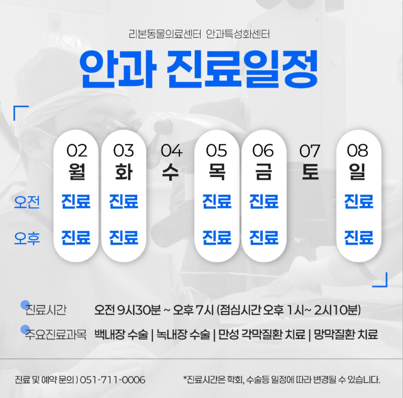 리본동물의료센터 안과는 영상의학과·내과·외과 등 각 분야의 전문 수의사와 협진을 통해 복합적인 안과 질환을 체계적으로 진단하고 치료합니다!