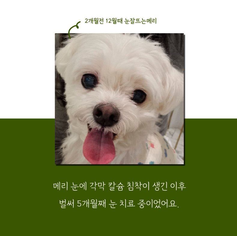 메리는 각막 칼슘 침착 이후 약 5개월 동안 눈 치료를 이어오던 중, 최근 각막 신생혈관에서 출혈이 발생해 내원했습니다.