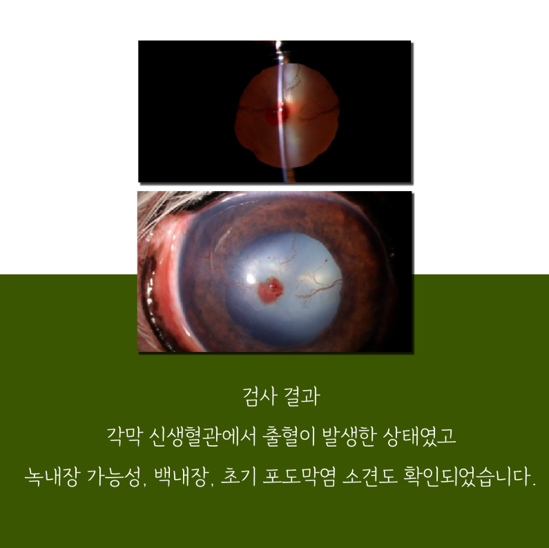 검사 결과, 혈관에서 출혈이 생긴 상태였으며 녹내장 가능성이 조금 있고, 백내장은 오른쪽보다 왼쪽이 더 진행된 상태였습니다.