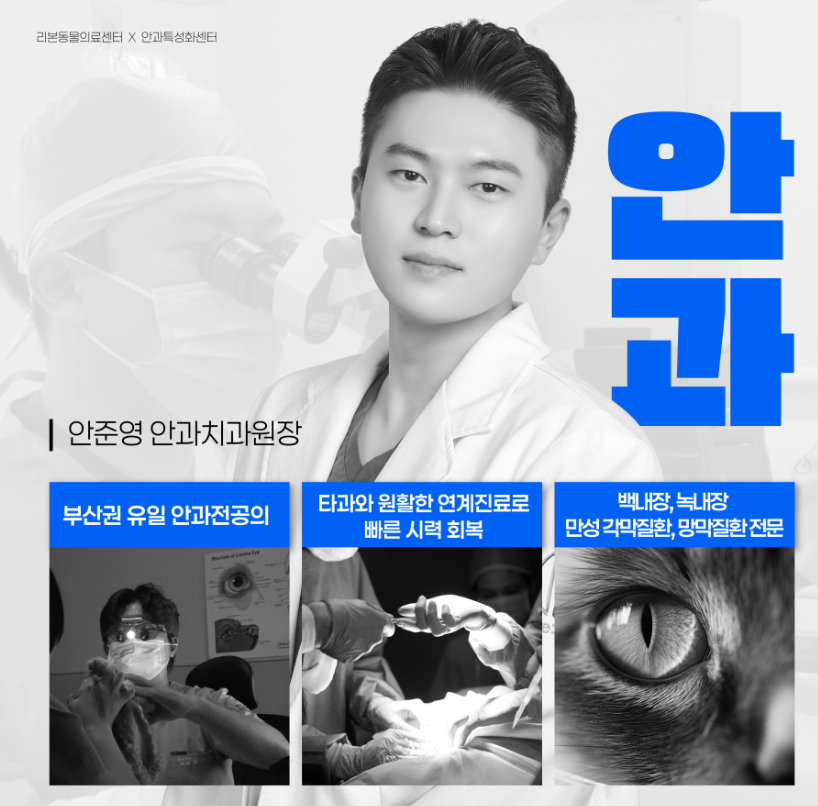 리본동물의료센터는 부산권 유일의 안과 전공의가 타과와의 원활한 협진을 바탕으로 아이들이 보다 빠르게 시력을 회복할 수 있도록 진료하고 있습니다.