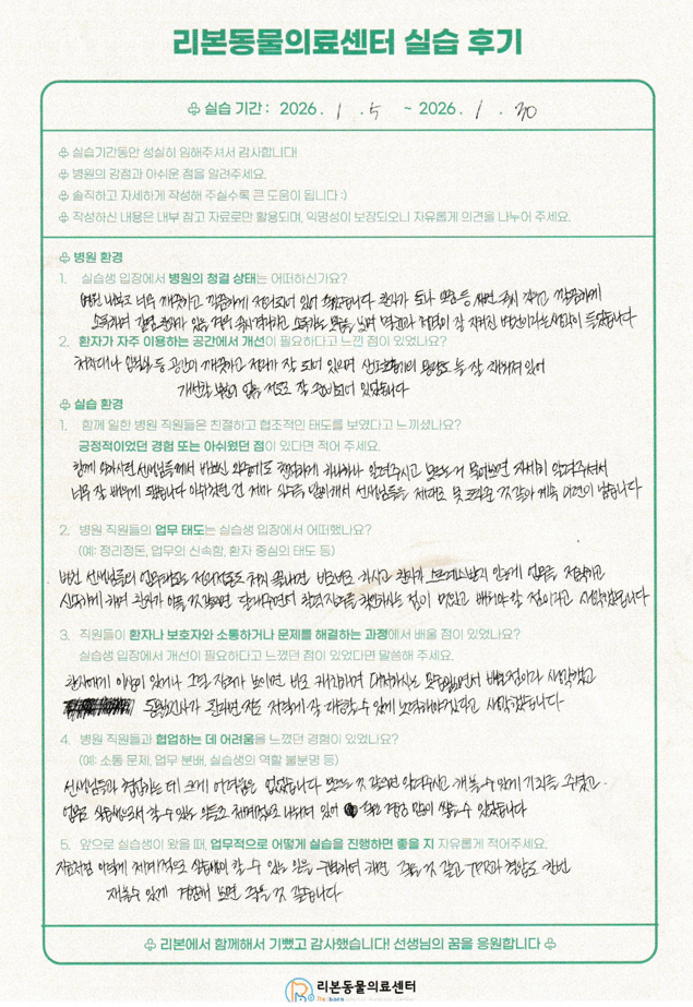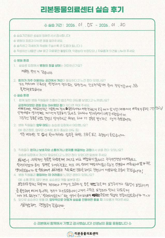 아래 후기는 병원을 외부의 시선으로 돌아보고 교육과 진료 환경을 함께 점검하는 데 참고하고 있습니다.