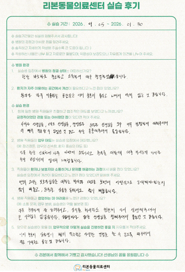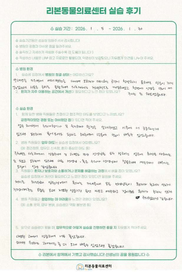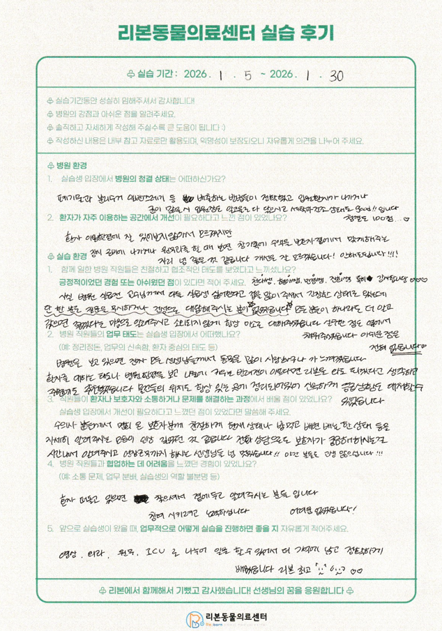 1월 5일부터 1월 30일까지 신라대학교, 인제대학교, 경성대학교 수의 테크니션 실습생들이 리본동물의료센터에서 실습을 진행했습니다.